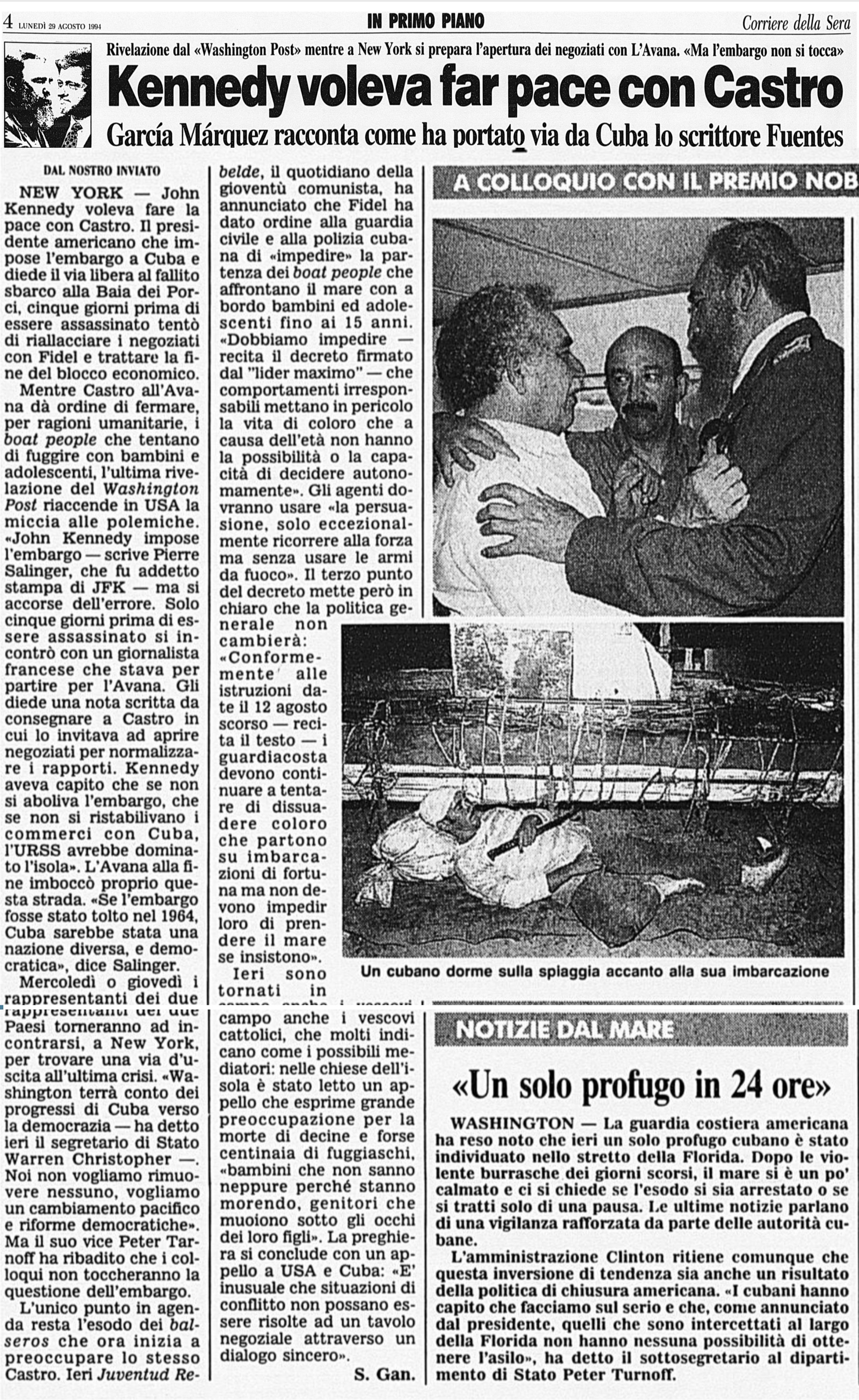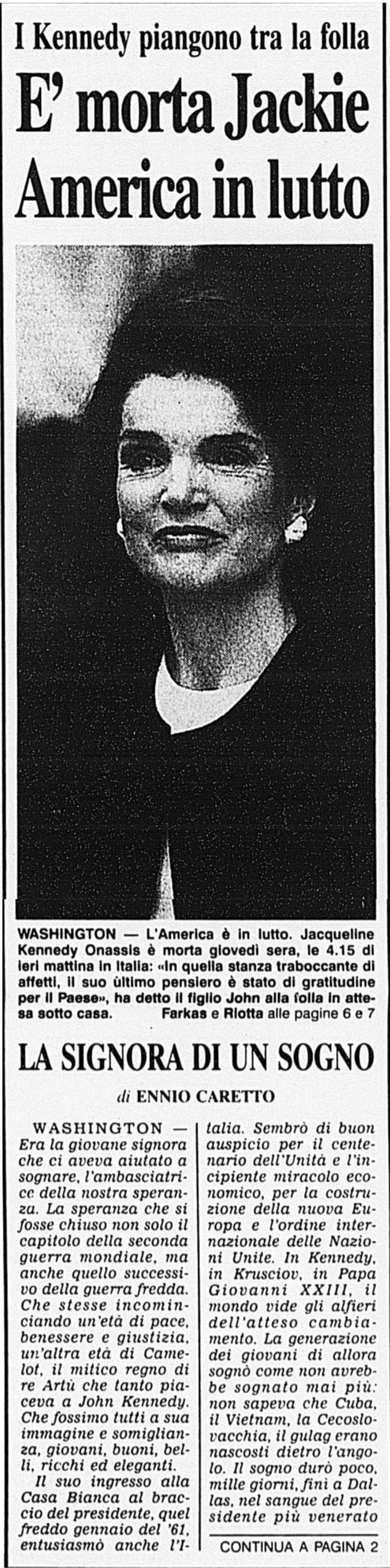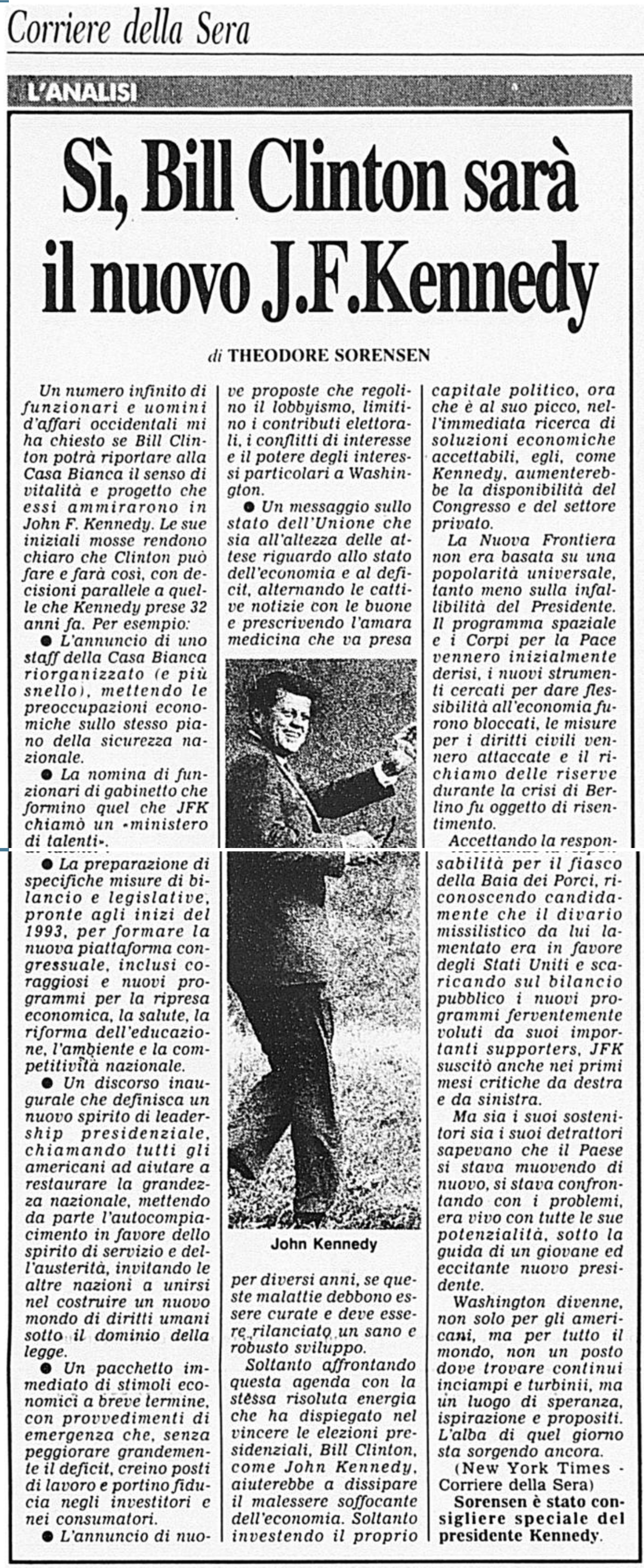 Front-page article (by Tullio Kezich): "From Kennedy to Italy, here is the
