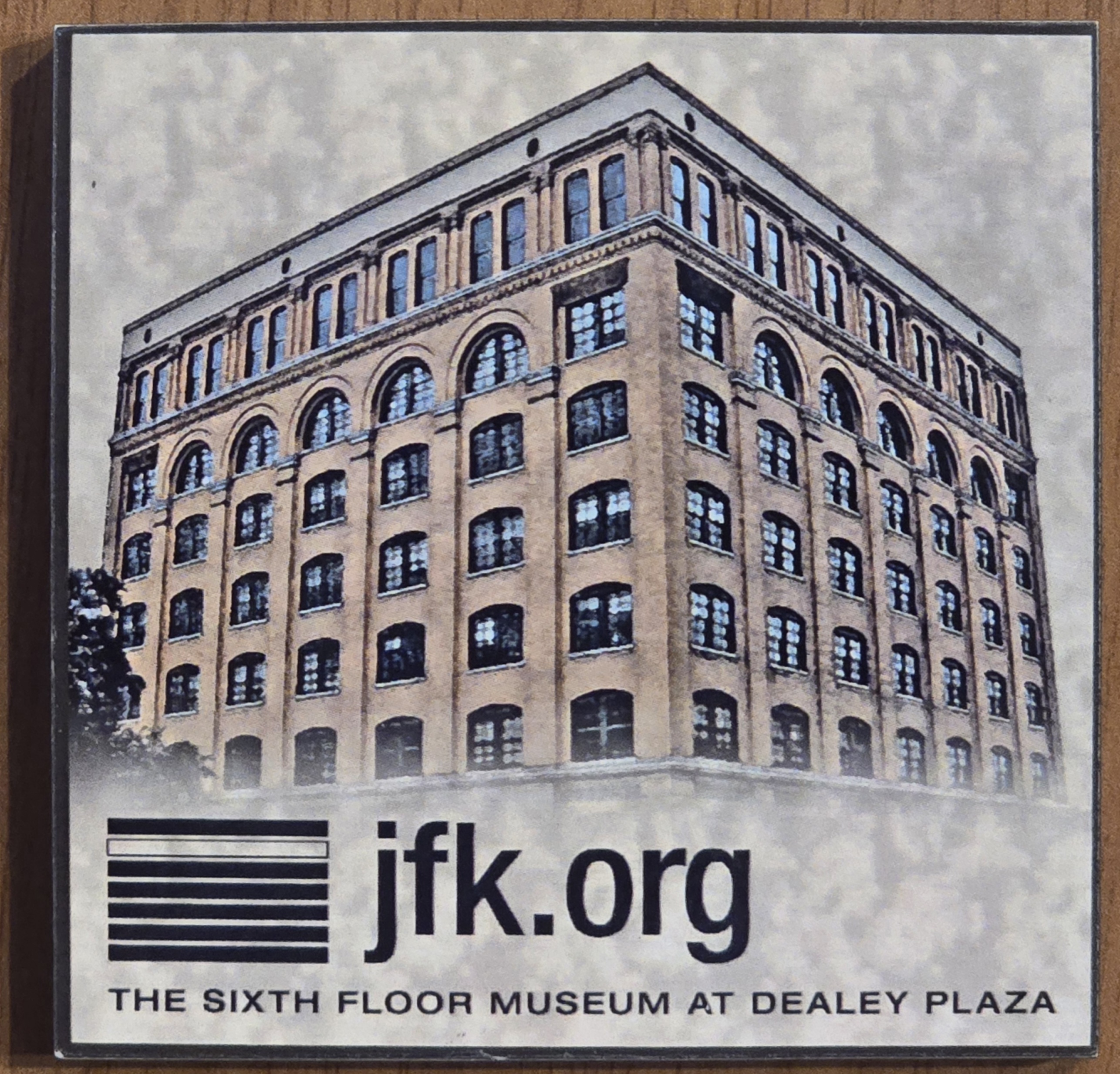 On the side : circular logo with drawing of Texas School Book Depository building.